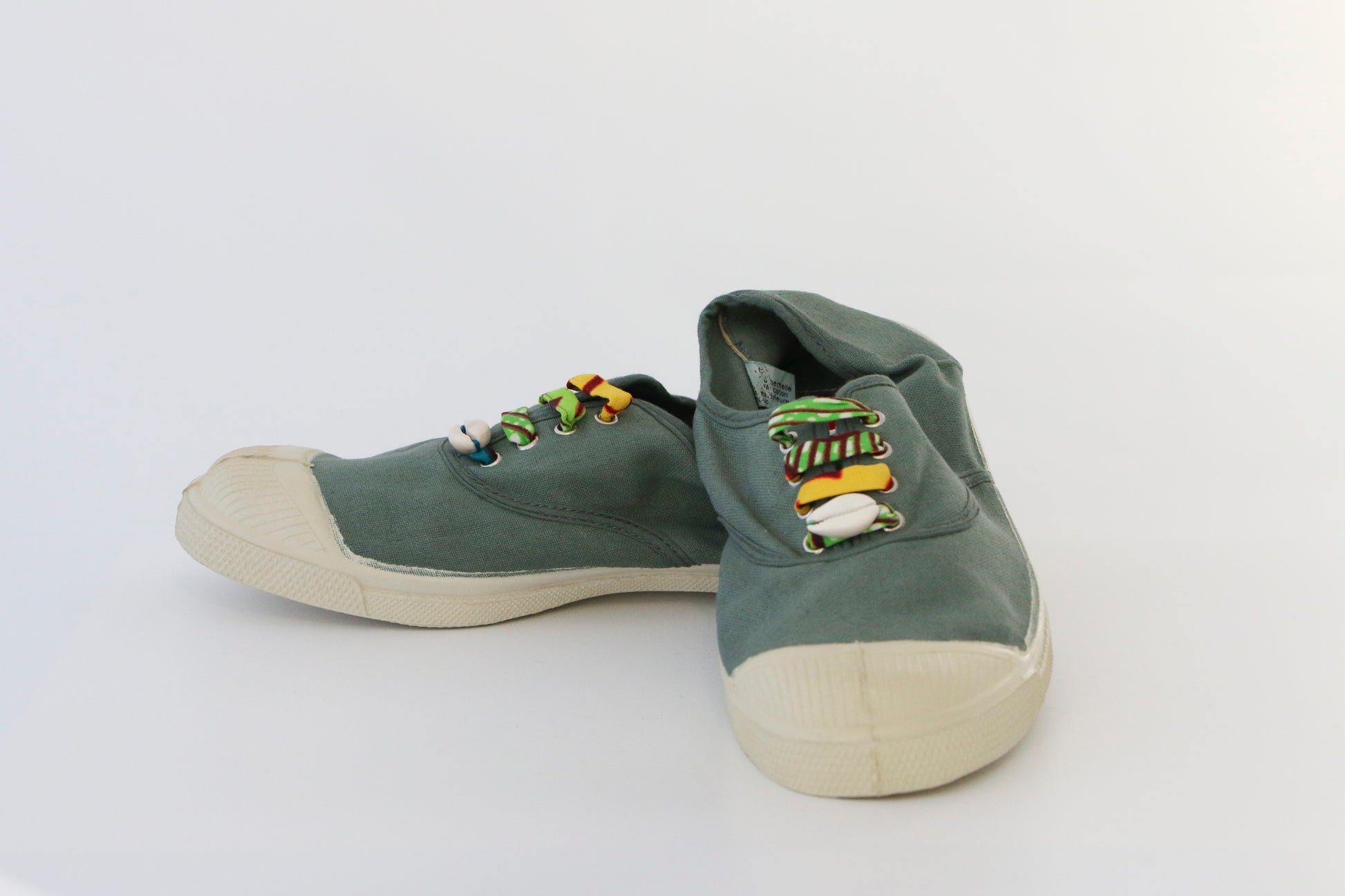 La chaussure Bensimon Vert vous offre un look unique avec ses lacets colorés en tissu coton wax muni d'un Cauri.