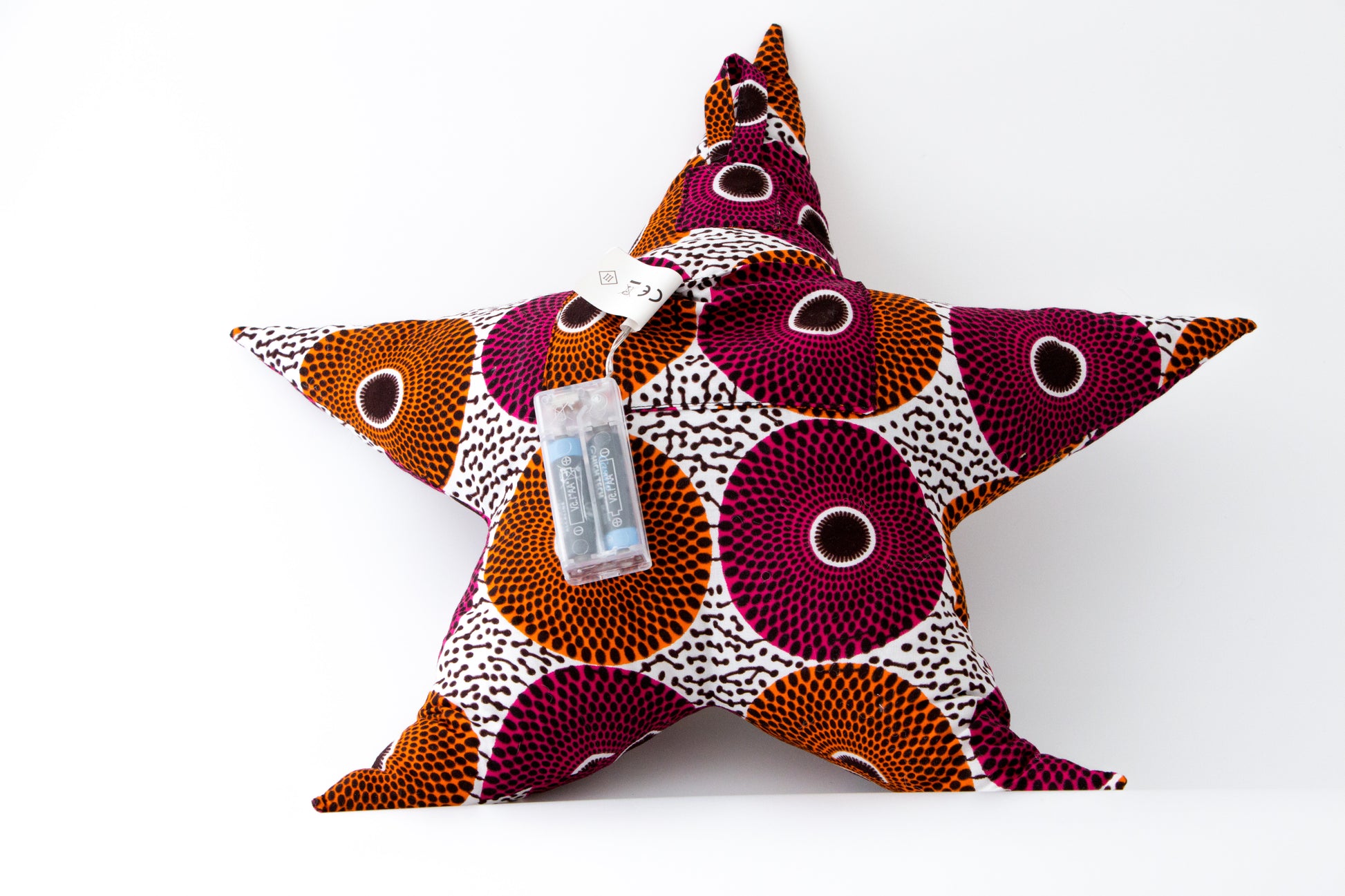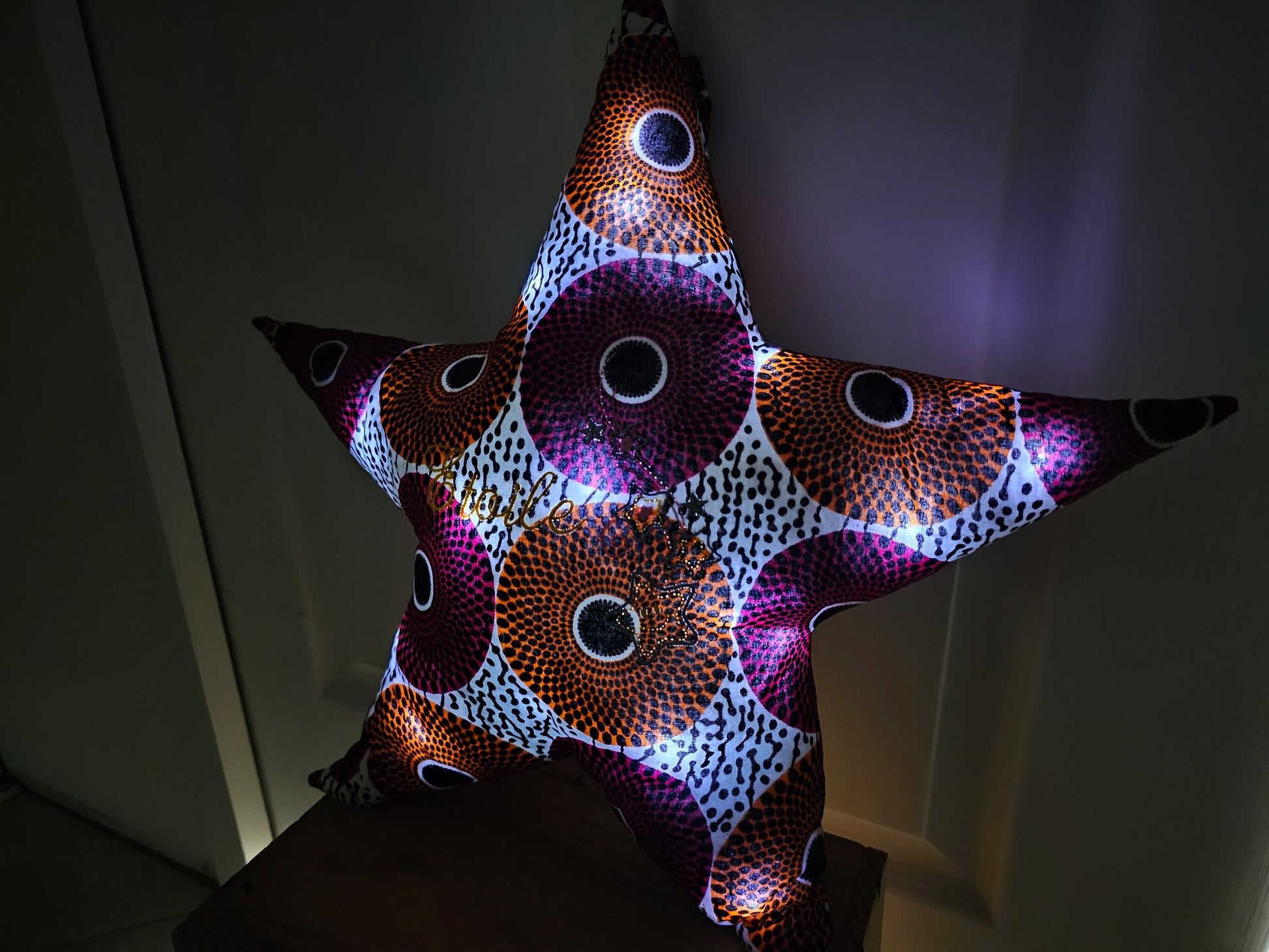 Illuminez la chambre de votre enfant avec notre coussin lumineux, cousu avec du tissu wax il est brodé et possède une guirlande lumineuse LED.