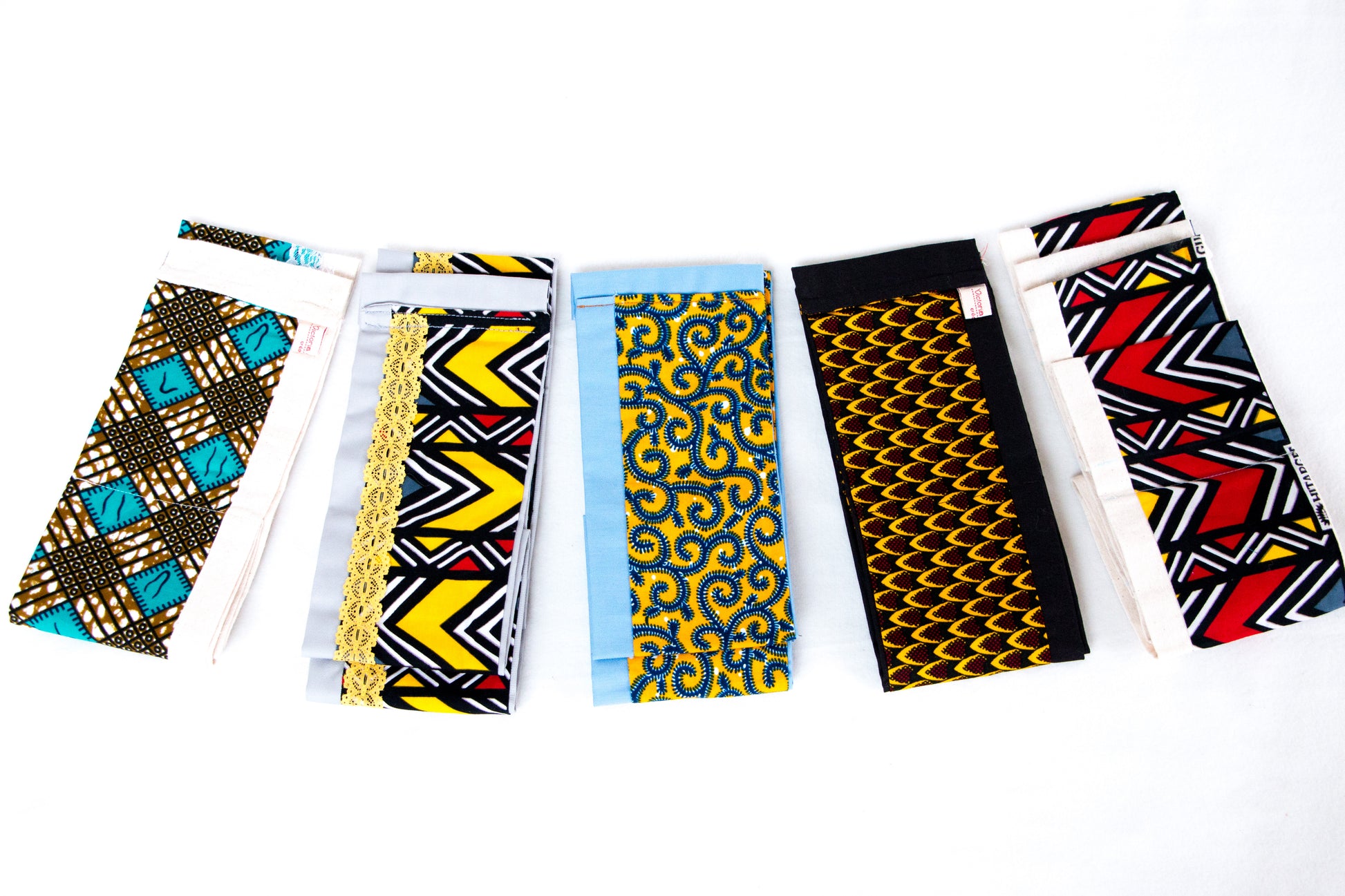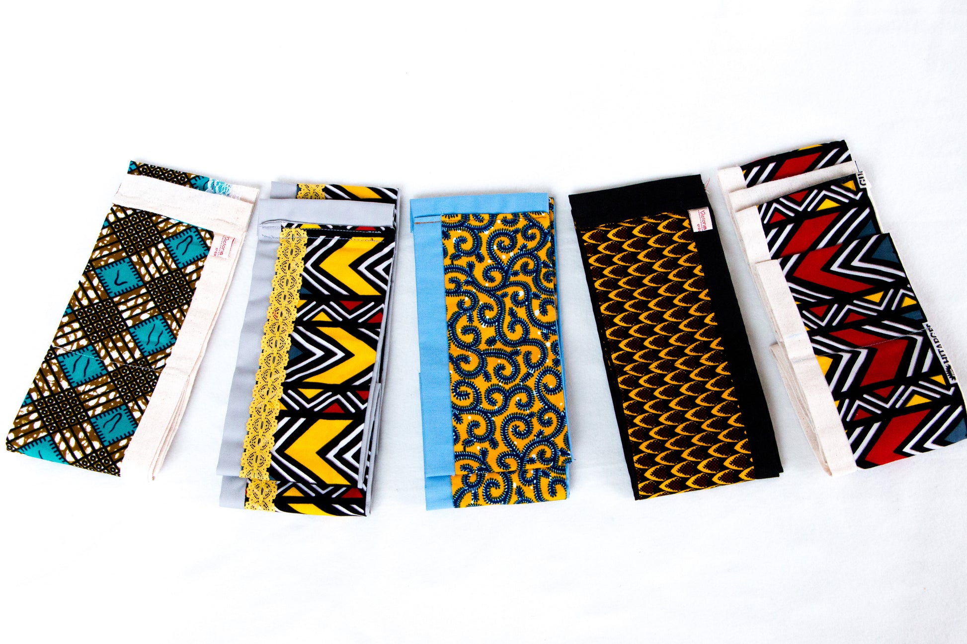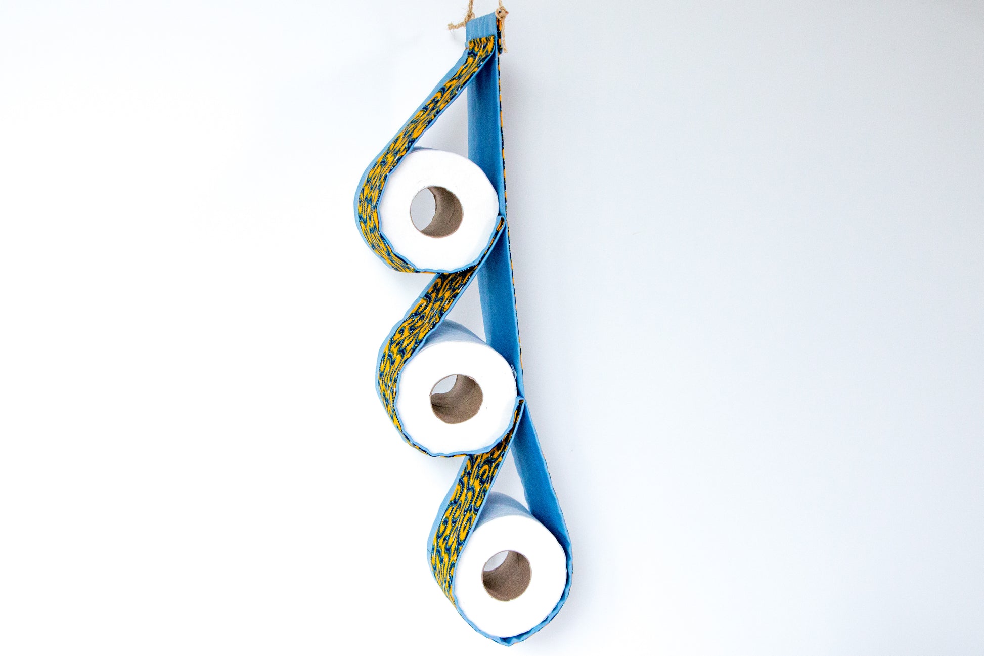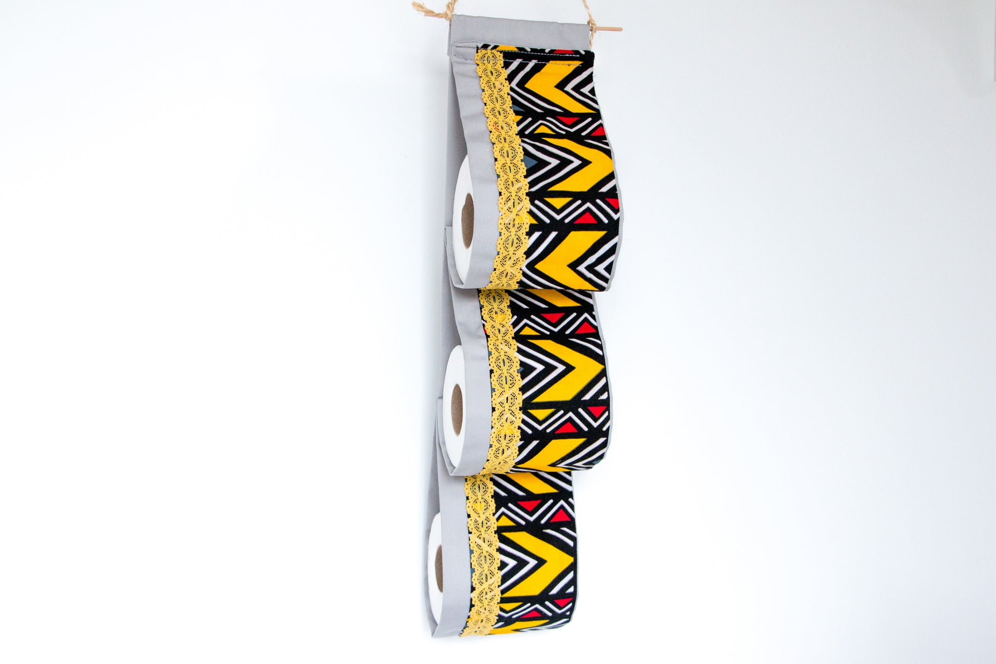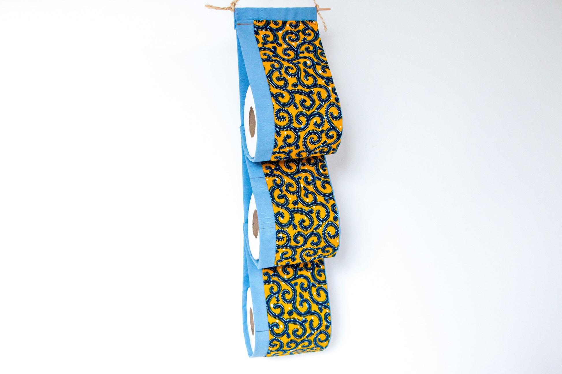 Ce porte papier toilette cousu avec de tissu coton wax possède trois compartiments pour loger vos rouleaux de papier toilette.